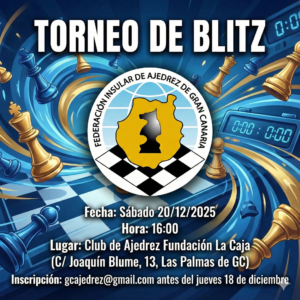 Torneo Blitz Navidad 2025 Organiza: Club de Ajedrez Fundación La CajaColabora: Casa de Galicia de Las Palmas La Federación Insular de Ajedrez de Gran Canaria anuncia el tradicional Torneo Blitz