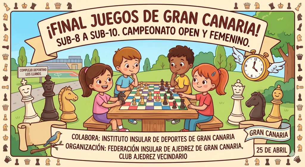 Final de los Juegos de Gran Canaria: Categorías Sub-8 y Sub-10 La Federación Insular de Ajedrez de Gran Canaria , en colaboración con el Club Ajedrez Vecindario y el Instituto Insular de Deportes , anuncia la celebración de la Final de los Juegos de Gran Canaria para las categorías de los más jóvenes: Sub-8 y […]
